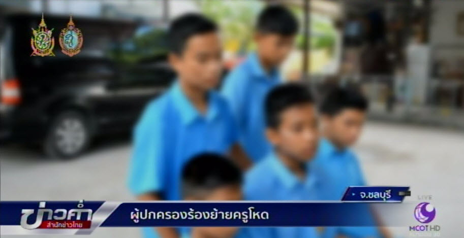 ชลบุรี 18 ก.ย. – ผู้ปกครองในจังหวัดชลบุรีเรียกร้องผู้เกี่ยวข้องย้าย 2 ครูโหดใช้ไม้พลองลูกเสือตีนักเรียน จนหัก และใช้เท้าถีบนักเรียนที่หน้าจนบาดเจ็บ