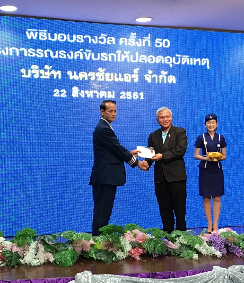 บริษัท นครชัยแอร์ จำกัด ได้จัดพิธีมอบรางวัลตามโครงการรณรงค์ขับรถให้ปลอดอุบัติเหตุ ครั้งที่ 50 โดยมีนายสนิท พรหมวงษ์ อธิบดีกรมการขนส่งทางบก เป็นประธานมอบเงินรางวัลพร้อมโล่เกียรติยศแก่พนักงานขับรถดีที่ผ่านเกณฑ์พิจารณารอบการประเมินผลระหว่างวันที่ 1 มกราคม – 30 มิถุนายน 2561 มีพนักงานขับรถเข้ารับรางวัล 351 คน จากพนักงานขับรถที่เข้าร่วมโครงการฯ 463 คน ในจำนวนนี้มีผู้ได้รับรางวัลขับรถดีเด่น 179 คน ขับรถดี 51 คน รางวัลชมเชย 30 คน รางวัลเสริมกำลังใจ 91 คน และมีผู้ขับรถดีเด่นติดต่อกัน 2 – 10 ครั้ง ได้รับโล่เกียรติยศ รวม 85 คน รวมเงินรางวัลทั้งสิ้น 10,805,000 บาท