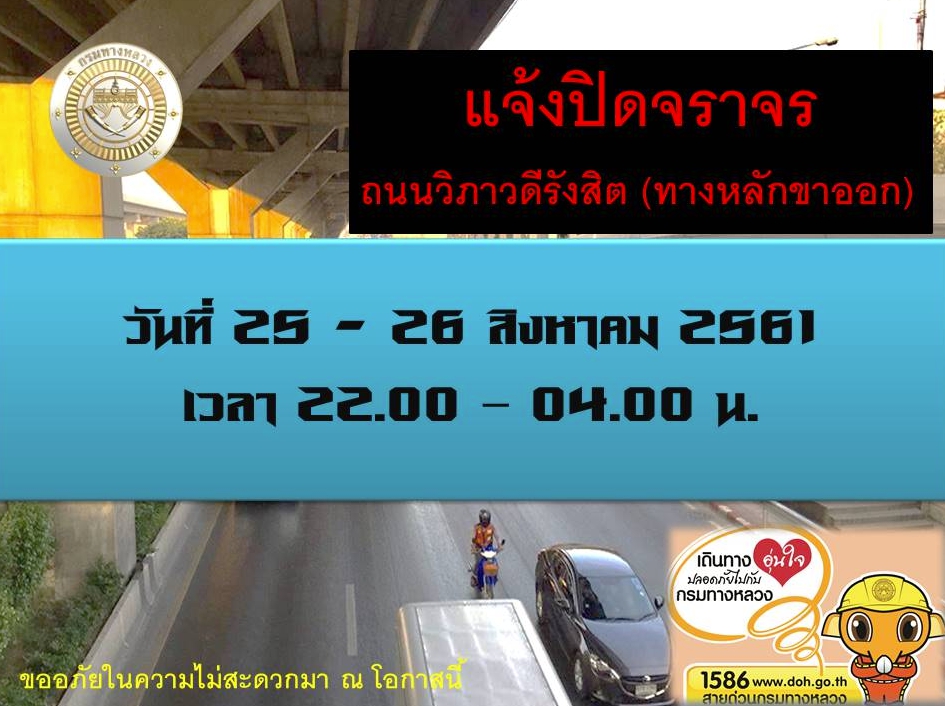 กรมทางหลวง โดยสำนักงานทางหลวงที่ 13 (กรุงเทพ) จะดำเนินโครงการก่อสร้างสะพานเข้าอาคารผู้โดยสาร ท่าอากาศยานดอนเมือง บนทางหลวงหมายเลข 31 (ถนนวิภาวดีรังสิต) ที่ กม.24+279 จึงมีความจำเป็นต้องปิดการจราจรช่องทางหลักขาออกชั่วคราว ในวันที่ 25 – 26 สิงหาคม 2561 ระหว่างเวลา 22.00 – 04.00 น. เพื่อทำการขนย้ายและติดตั้งคานเหล็ก(Steel Girder) 5 คาน พร้อมอุปกรณ์ช่วงข้ามถนนวิภาวดีรังสิต โดยขอให้ผู้ใช้ทางไปใช้ช่องทางคู่ขนานแทน