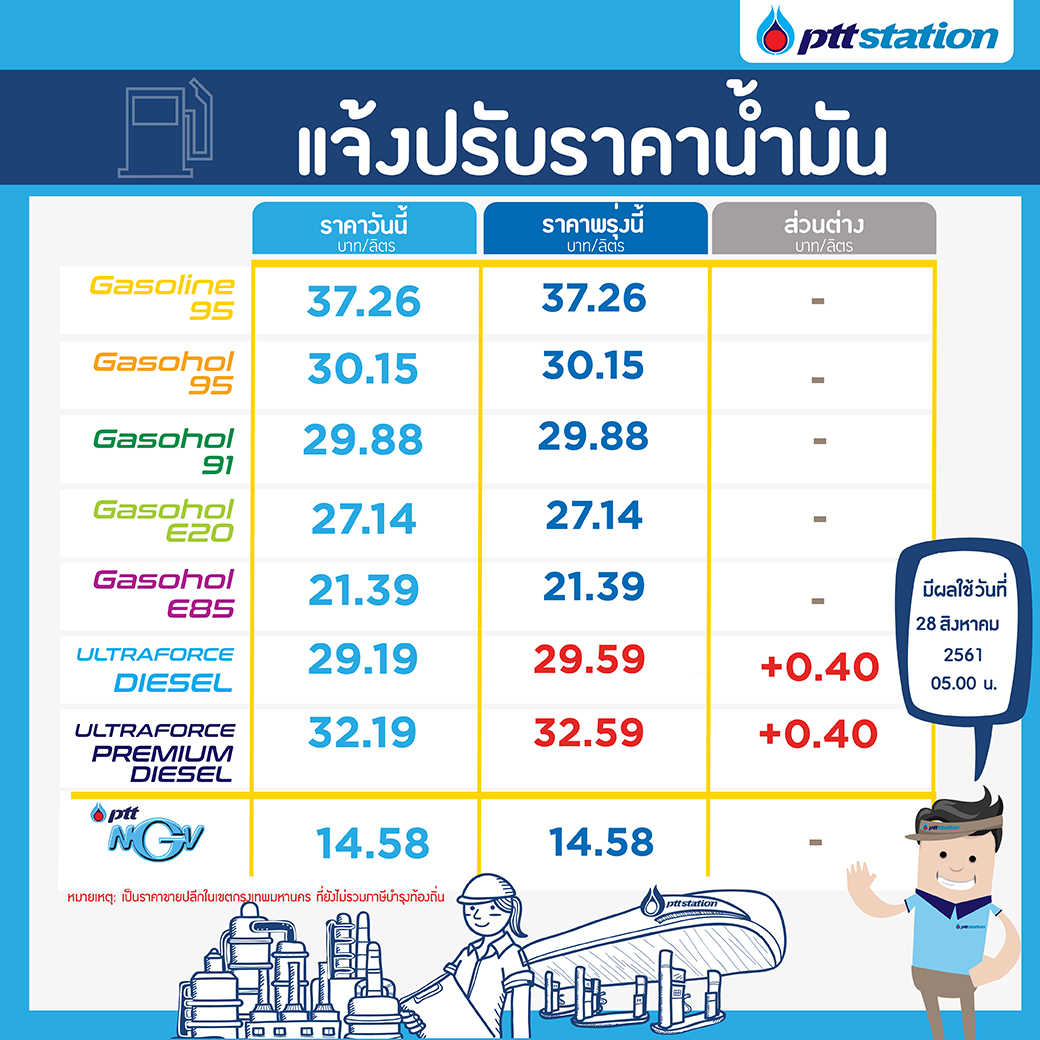 PTTOR ปรับราคาขายปลีกน้ำมันดีเซลและดีเซลพรีเมี่ยม เพิ่มขึ้น 40 สตางค์ต่อลิตร ส่วนชนิดอื่นคงเดิม มีผล 28 สิงหาคม 2561 เวลา 05.00 น.เป็นต้นไป โดยราคาขายปลีกจะเป็นดังนี้ เบนซิน 37.26 บาท แก๊สโซฮอล์ 95 ลิตรละ 30.15 บาท E20 ลิตรละ 27.14 บาท แก๊สโซฮอล์ 91 ลิตรละ 29.88 บาท E85 ลิตรละ 21.39 บาท ดีเซล 29.59 และดีเซลพรีเมี่ยม 32.59 บาทต่อลิตร โดยราคาขายปลีกข้างต้นยังไม่รวมภาษีบำรุงกรุงเทพมหานคร.-สำนักข่าวไทย
