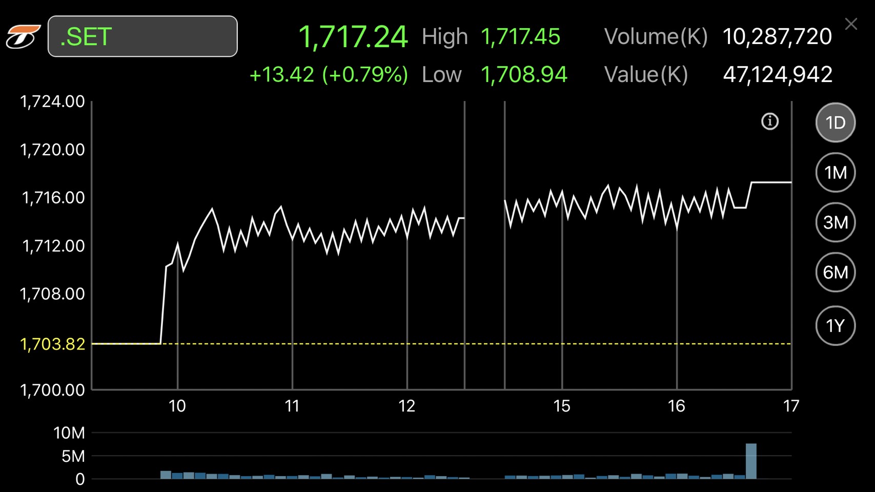 ผู้สื่อข่าวรายงานว่าดัชนีตลาดหลักทรัพย์ฯ ปิดการซื้อขายที่ 1,717.24 จุด เพิ่มขึ้น 13.42 จุด หรือร้อยละ 0.79 มูลค่าการซื้อขาย 47,124.94 ล้านบาท