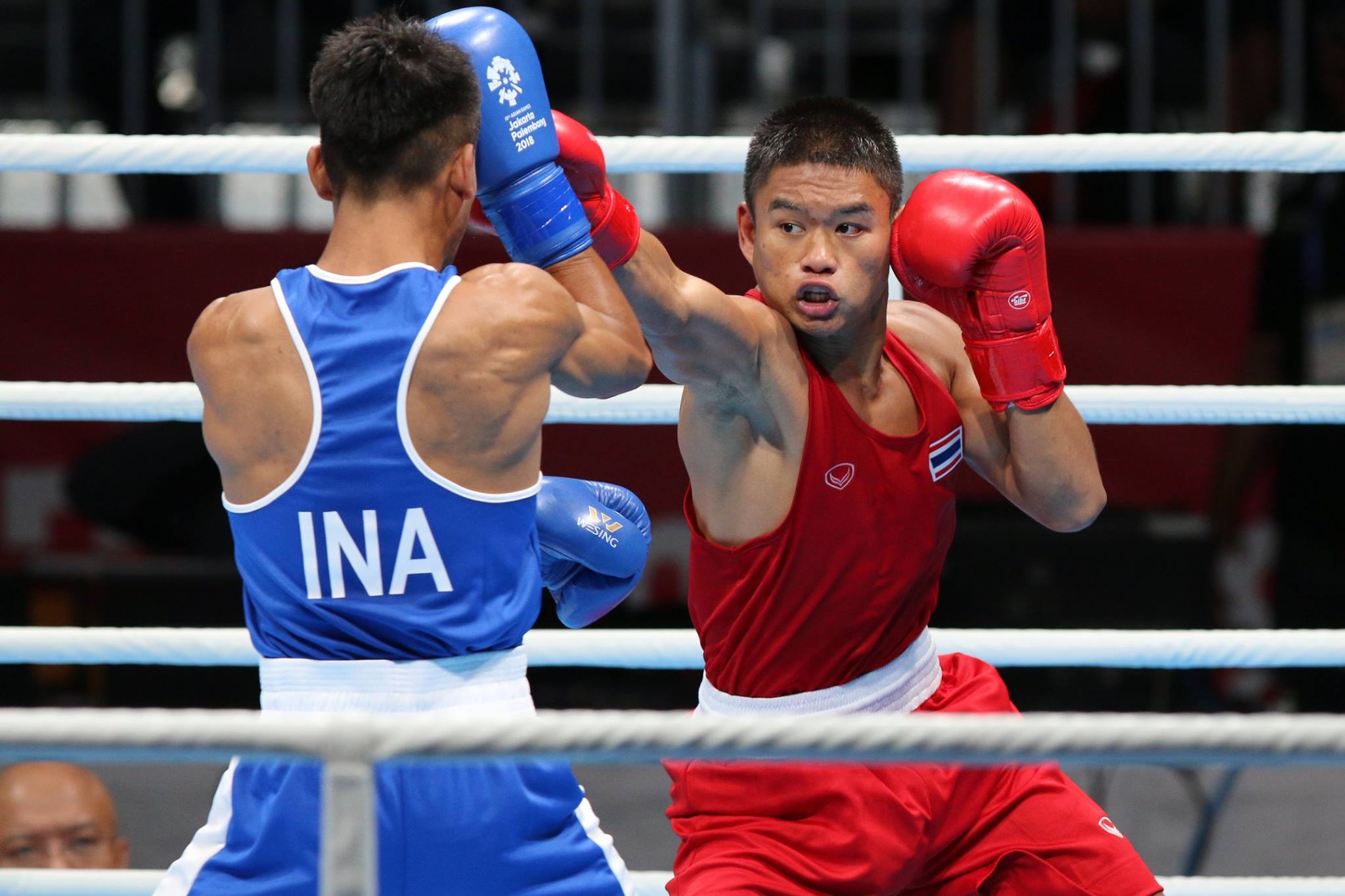 อินโดนีเซีย. 28 ส.ค. 2561.-มวยสากลสมัครเล่น กีฬาเอเชี่ยนเกมส์ ครั้งที่18 ที่กรุงจาการ์ตา ประเทศอินโดนีเซีย รุ่น 60 กก.ชาย รอบ 8 คนสุดท้าย รุตชการญ์ จันทร์ตรง (แดง) นักชกทีมชาติไทยเดินหน้าออกหมัดใส่ เฟอร์นาน ปาเป็นดัง จากเจ้าภาพ อินโดนีเซีย ก่อนเอาชนะไป 5-0 คะแนน ผ่านเข้ารอบรองชนะเลิศได้สำเร็จ โดยจะผ่านเข้าไปพบกับ ชุนกอร์ อับดูลาซูรอฟ จากอุซเบกิสถาน และการันตีการคว้าเหรียญทองแดงแน่นอนแล้ว.-สำนักข่าวไทย