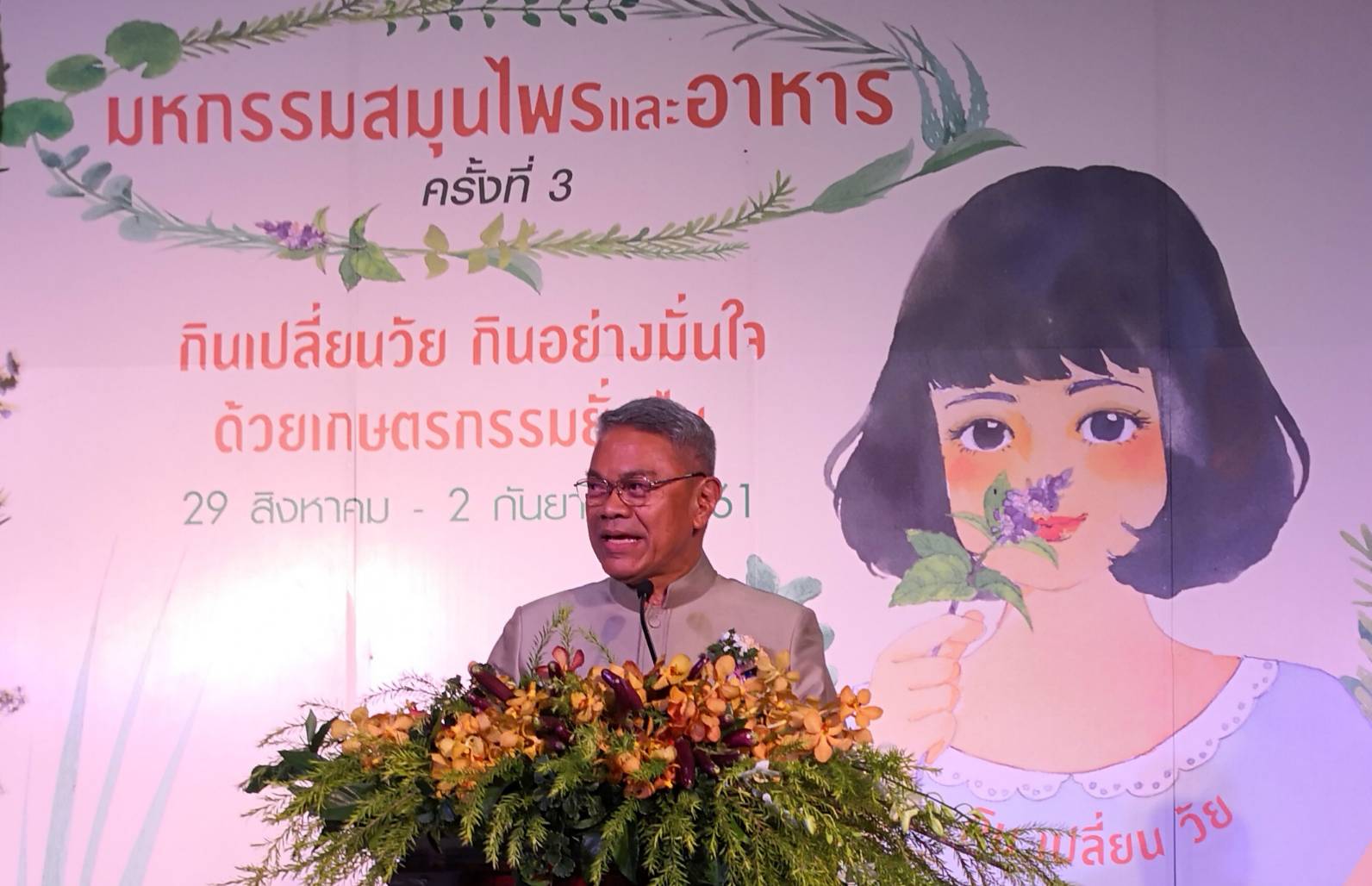 นายวิวัฒน์ ศัลยกำธร รัฐมนตรีช่วยว่าการกระทรวงเกษตรและสหกรณ์ เป็นประธานเปิดงานมหกรรมสมุนไพรและอาหาร ครั้งที่ 3 “กินเปลี่ยนวัย กินอย่างมั่นใจ ด้วยเกษตรกรรมยั่งยืน” ระหว่างวันที่ 29 สิงหาคม – 2 กันยายน 2561 ที่อิมแพ็ค เมืองทองธานี จัดโดยกระทรวงเกษตรฯ กระทรวงสาธารณสุข กระทรวงมหาดไทย และภาคีเครือข่าย โดยระบุว่าการจัดงานครั้งนี้มีวัตถุประสงค์เพื่อสร้างความรับรู้ความเข้าใจเกี่ยวกับเกษตรกรรมยั่งยืนต่อทุกภาคส่วนให้เกิดการรับรู้นโยบายและเกิดกระแสความสนใจ ซึ่งเป็นส่วนสำคัญต่อการขับเคลื่อนเกษตรกรรมยั่งยืนให้เกิดผลสัมฤทธิ์ก่อให้เกิดการขยายผลของการส่งเสริมและพัฒนาระบบเกษตรกรรมยั่งยืนได้อย่างมีประสิทธิภาพ อีกทั้งเพื่อรณรงค์ให้ประชาชนหันมาใช้สมุนไพรเพื่อการพึ่งพาตนเอง สามารถนำพืชผัก สมุนไพรใกล้ตัว มาใช้ประโยชน์ทั้งเป็นอาหารและยาได้
