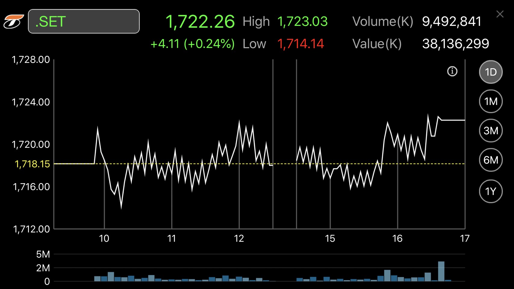 ผู้สื่อข่าวรายงานว่าดัชนีตลาดหลักทรัพย์ฯ ปิดวันนี้ที่ระดับ 1,722.26 จุด เพิ่มขึ้น 4.11 จุด หรือร้อยละ 0.24 มูลค่าการซื้อขาย 38,136.30 ล้านบาท การซื้อขายหุ้นวันนี้ดัชนีเคลื่อนไหวทั้งแดนบวก-ลบ โดยดัชนีฯ แตะจุดสูงสุดที่ 1,723.03 จุด และแตะจุดต่ำสุดที่ระดับ 1,714.14 จุด