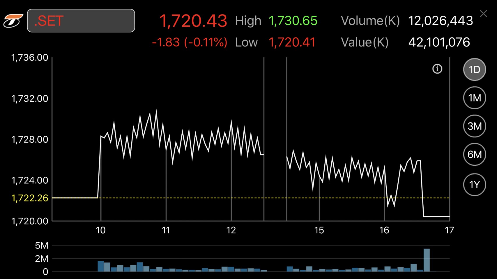 ตลาดหลักทรัพย์ปิดวันนี้ที่ระดับ 1,720.43 จุด ลดลง 1.83 จุด (-0.11%) มูลค่าการซื้อขาย 42,101.08 ล้านบาท