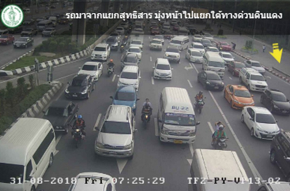 ถนนวิภาวดี-รังสิต ขาเข้า มุ่งหน้าใต้ด่วนดินแดง รถเคลื่อนตัวได้ช้า ท้ายสะสมอยู่ที่หน้าโรงเรียนสุรศักดิ์มนตรี