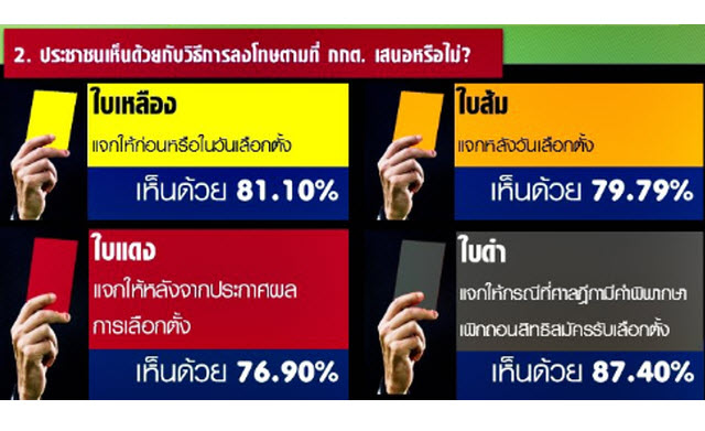 ใบดำ แจกให้กรณีที่ศาลฎีกามีคำพิพากษาเพิกถอนสิทธิสมัครรับเลือกตั้ง ร้อยละ 87.40 เห็นด้วย เพราะเป็นการลงโทษขั้นเด็ดขาด เป็นการขุดรากถอนโคน บทลงโทษรุนแรงเหมาะสมดี จะได้เกรงกลัว ไม่กล้ากระทำผิด ทำให้การเลือกตั้งมีความโปร่งใสมากขึ้น ร้อยละ 3.68 ไม่เห็นด้วย เพราะควรลงโทษด้วยวิธีการอื่น บทลงโทษหนักเกินไป ขั้นตอนการพิจารณาความผิดอาจไม่โปร่งใส ไม่เป็นมาตรฐานเดียวกัน อาจตัดสินคนผิดได้