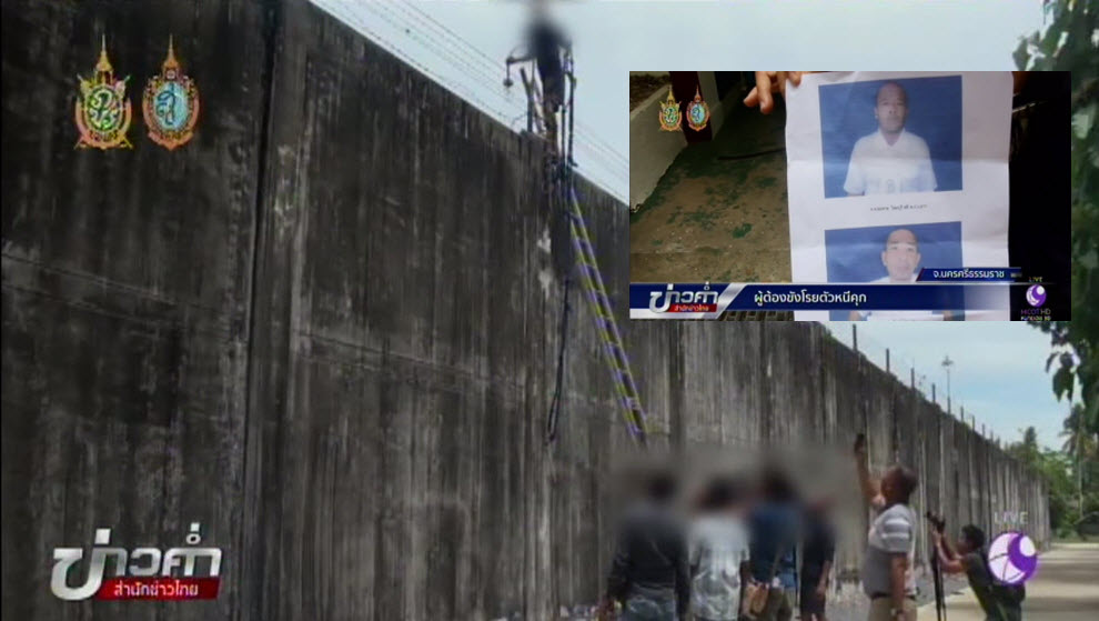 นครศรีธรรมราช 16 ก.ย.-เจ้าหน้าที่เร่งติดตามตัว 2 ผู้ต้องขังหลบหนีออกจากเรือนจำนครศรีธรรมราชก่อเหตุใช้ผ้าห่มมัดต่อกันเป็นเชือกโรยตัวจากกำแพงสูง 10 เมตร