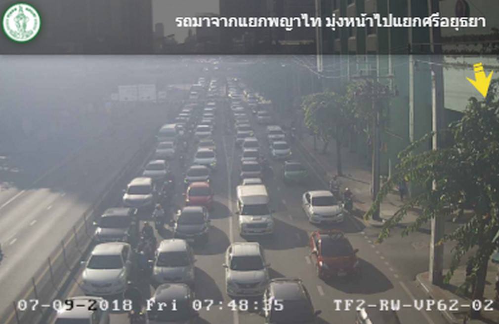 กทม. 7 ก.ย. – สวพ.FM91 รายงานการจราจรเช้าวันศุกร์ ถนนศรีอยุธยา ขาออก มุ่งหน้าแยกศรีอยุธยา รถติดขัด ท้ายสะสมขึ้นไปบนยกระดับจตุรทิศ ช่วงเหนือบึงมักกะสัน