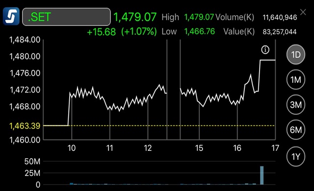 ตลท. 16 ก.ย. – ผู้สื่อข่าวรายงานว่าดัชนีตลาดหลักทรัพย์ปิดการซื้อขายวันนี้ (16 ก.ย.) ที่ระดับ 1,479.07 จุด เพิ่มขึ้น 15.68 จุด หรือร้อยละ 1.07 มูลค่าการซื้อขาย 83,257.04 ล้านบาท โดยดัชนีเคลื่อนไหวแดนบวกตลอดทั้งวัน แตะจุดสูงสุดของวันที่ระดับ 1,479.07 จุด มีแรงซื้อเข้ามาหนาแน่นในหุ้นกลุ่มขนาดใหญ่ ส่วนดัชนีต่ำสุดของวันที่ระดับ 1,466.76 จุด
