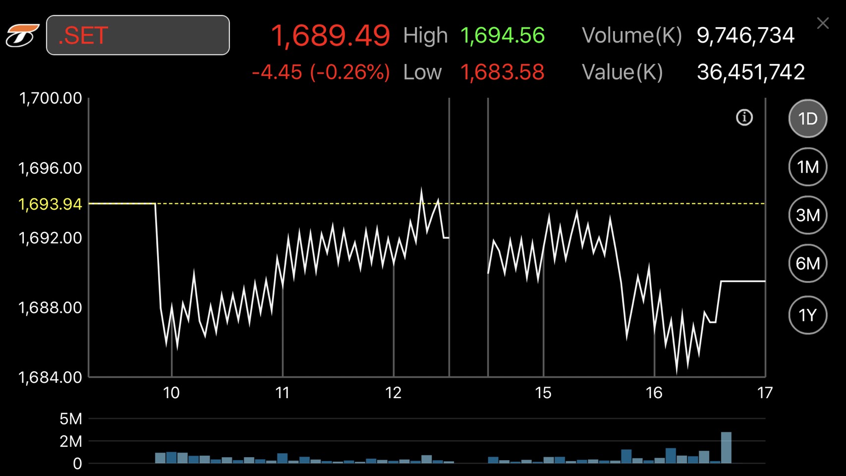 การซื้อขายหุ้นวันนี้ ดัชนีหุ้นไทยเคลื่อนไหวในแดนลบเป็นส่วนใหญ่ โดยดัชนีฯแตะจุดสูงสุดที่ 1,694.56 จุด และแตะจุดต่ำสุดที่ระดับ 1,683.58 จุด