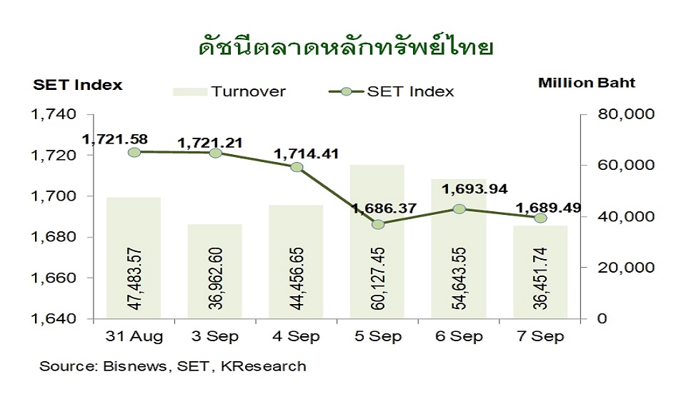 บริษัทศูนย์วิจัยกสิกรไทย จำกัด สรุปความเคลื่อนไหวตลาดหุ้นไทยสัปดาห์นี้(3-7 ก.ย.) ว่า ดัชนีหุ้นไทยหลุดระดับ 1,700 จุดอีกครั้ง โดยดัชนี SET ปิดที่ระดับที่ 1,689.49 จุด ลดลง 1.86% จากสัปดาห์ก่อน ขณะที่ มูลค่าการซื้อขายเฉลี่ยต่อวันเพิ่มขึ้น 3.18% จากสัปดาห์ก่อน มาที่ 46,528.40 ล้านบาท ส่วนตลาดหลักทรัพย์ mai ปิดที่ 435.97 จุด ลดลง 0.69% จากสัปดาห์ก่อน ดัชนีหุ้นไทยปรับตัวลงหลุดระดับ 1,700 จุดในช่วงต้น-กลางสัปดาห์ สอดคล้องกับการเคลื่อนไหวในภาพรวมของตลาดหุ้นต่างประเทศ ท่ามกลางแรงกดดันต่อสินทรัพย์และสกุลเงินในกลุ่มประเทศตลาดเกิดใหม่ ประกอบกับตลาดมีความกังวลต่อประเด็นข้อพิพาททางการค้าระหว่างสหรัฐฯ และประเทศคู่ค้าสำคัญ ทั้งแคนาดา และจีน ทั้งนี้ นักลงทุนต่างชาติ มีสถานะขายสุทธิหุ้นไทยตลอดสัปดาห์ แม้ว่าดัชนีจะเริ่มแกว่งตัวในกรอบแคบๆ ก่อนการรายงานตัวเลขการจ้างงานนอกภาคเกษตรของสหรัฐฯ ในช่วงปลายสัปดาห์ก็ตาม
