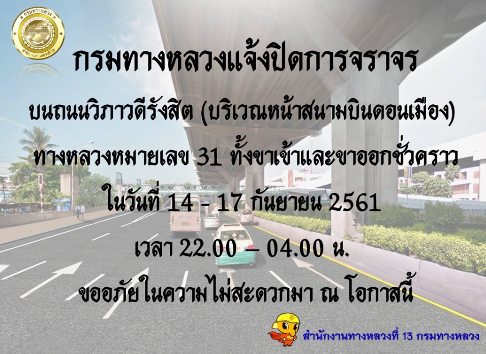 ในการนี้ศูนย์สร้างและบูรณะสะพานที่ 3 (ปทุมธานี) จะดำเนินการปิดการจราจรทั้งขาเข้าและขาออก บนทางหลวงหมายเลข 31 (ถนนวิภาวดีรังสิต) ตอนงามวงศ์วาน – ดอนเมือง ที่ กม.24+279 ระหว่างวันที่ 14 – 17 กันยายน 2561 เวลา 22.00 – 04.00 น. เพื่อปรับปรุงสะพานลอยคนเดินข้ามบริเวณหน้าสนามบินดอนเมือง โดยถนนวิภาวดีรังสิตฝั่งขาเข้าจะทำการปิดช่องทางหลักชั่วคราว ระหว่าง กม. 24+000 – 24+300 ให้เบี่ยงไปใช้ช่องทางหลักขาออกแทน และถนนวิภาวดีรังสิตฝั่งขาออกจะทำการปิดช่องทางหลักชั่วคราว ระหว่าง กม. 24+000 – 24+300 ให้ใช้ช่องทางคู่ขนานขาออกหน้าวัดดอนเมืองแทน