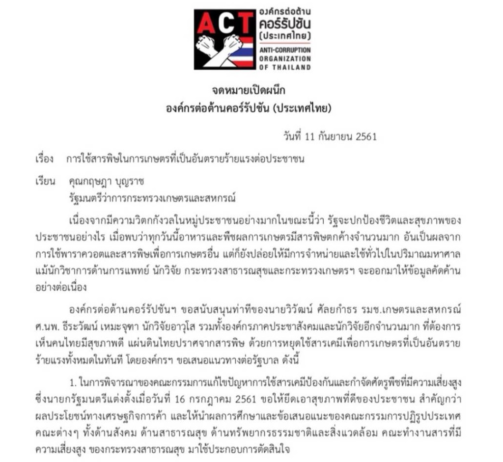 ภายหลังจากองค์กรต่อต้านคอร์รัปชัน (ประเทศไทย) ได้ทำจดหมายเปิดผนึกถึงรัฐมนตรีว่าการกระทรวงเกษตรและสหกรณ์ ขอให้ยุติการใช้สารเคมีเพื่อการเกษตรอันตรายร้ายแรงทั้งหมดทันที และสอบสวนเชิงลึกว่ามีการเอื้อประโยชน์ของผู้ที่เกี่ยวข้องกับนักธุรกิจสารพิษเพื่อการเกษตรหรือไม่