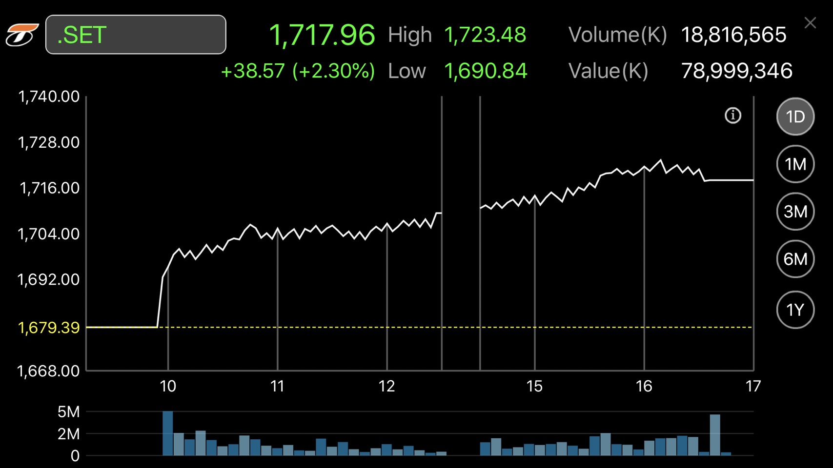 ผู้สื่อข่าวรายงานว่าดัชนีตลาดหลักทรัพย์ฯ ปิดวันนี้ (13 ก.ย.) ที่ระดับ 1,717.96 จุด เพิ่มขึ้น 38.57 จุด หรือร้อยละ 2.30 มูลค่าการซื้อขาย 78,999.35 ล้านบาท การซื้อขายหุ้นวันนี้ดัชนีเคลื่อนไหวแดนบวกตลอดทั้งวัน โดยดัชนีฯ แตะจุดสูงสุดที่ 1,723.48 จุด และแตะจุดต่ำสุดที่ระดับ 1,690.84 จุด