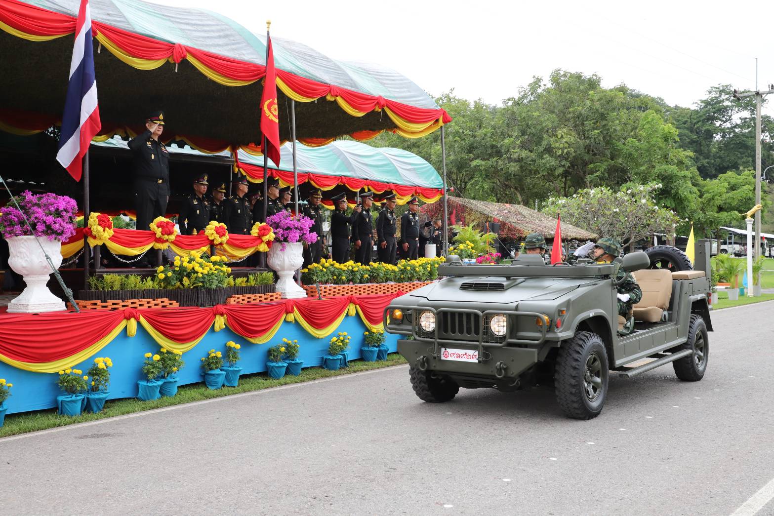 ผู้สื่อข่าวรายงานว่ารองปลัดกระทรวงกลาโหมพร้อมผบ.ทบ.ได้ร่วมพิธีสวนสนามเชิดชูเกียรติ โดยพลประจำปืนใหญ่ทำการยิงปืนใหญ่จำนวน 1 นัด จากนั้น ทหารปืนใหญ่ 1 กองพัน เดินสวนสนามพร้อมด้วยการสวนสนามยานยนต์ที่ประจำการ