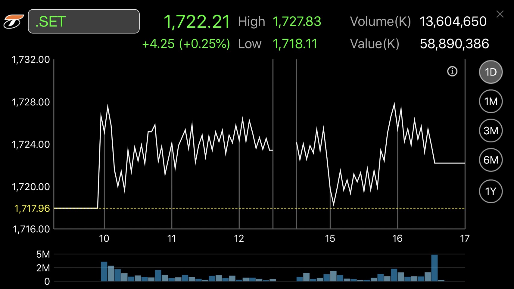 การซื้อขายหุ้นวันนี้ ดัชนีหุ้นไทยเคลื่อนไหวในแดนบวกตลอดทั้งวัน โดยดัชนีฯแตะจุดสูงสุดที่ 1,727.83 จุด และแตะจุดต่ำสุดที่ระดับ 1,718.11 จุด