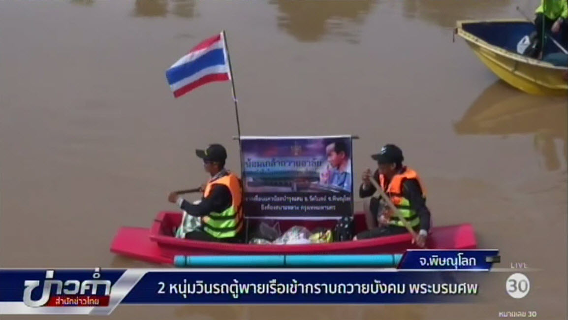ส่วน 2 หนุ่มอาชีพขับรถตู้ ซาบซึ้งในพระมหากรุณาธิคุณ พระบาทสมเด็จพระปรมินทรมหาภูมิพลอดุลยเดช ที่ทรงพัฒนาแหล่งน้ำเพื่อพสกนิกร พายเรือพลาสติกจากลำน้ำเขื่อนแควน้อยบำรุงแดน มุ่งหน้าพระบรมมหาราชวัง เพื่อกราบถวายบังคมพระบรมศพ โดยวันนี้เดินทางผ่านแม่น้ำน่าน และตั้งเป้าถึงแม่น้ำเจ้าพระยาใน 10 วัน