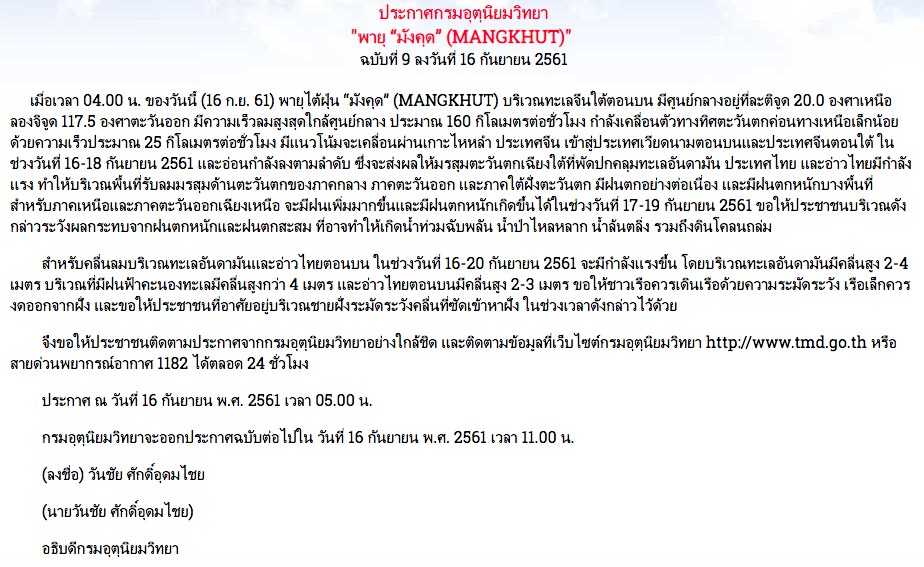 ประกาศกรมอุตุนิยมวิทยา พายุมังคุด (MANGKHUT)” ฉบับที่ 9 ลงวันที่ 16 กันยายน 2561 ระบุว่า เมื่อเวลา 04.00 น. ของวันนี้ (16 ก.ย. 61) พายุไต้ฝุ่น “มังคุด” (MANGKHUT) บริเวณทะเลจีนใต้ตอนบน มีศูนย์กลางอยู่ที่ละติจูด 20.0 องศาเหนือ ลองจิจูด 117.5 องศาตะวันออก มีความเร็วลมสูงสุดใกล้ศูนย์กลาง ประมาณ 160 กิโลเมตรต่อชั่วโมง กำลังเคลื่อนตัวทางทิศตะวันตกค่อนทางเหนือเล็กน้อย ด้วยความเร็วประมาณ 25 กิโลเมตรต่อชั่วโมง มีแนวโน้มจะเคลื่อนผ่านเกาะไหหลำ ประเทศจีน เข้าสู่ประเทศเวียดนามตอนบนและประเทศจีนตอนใต้ ในช่วงวันที่ 16-18 กันยายน 2561 และอ่อนกำลังลงตามลำดับ ซึ่งจะส่งผลให้มรสุมตะวันตกเฉียงใต้ที่พัดปกคลุมทะเลอันดามัน ประเทศไทย และอ่าวไทยมีกำลังแรง ทำให้บริเวณพื้นที่รับลมมรสุมด้านตะวันตกของภาคกลาง ภาคตะวันออก และภาคใต้ฝั่งตะวันตก มีฝนตกอย่างต่อเนื่อง และมีฝนตกหนักบางพื้นที่ สำหรับภาคเหนือและภาคตะวันออกเฉียงเหนือ จะมีฝนเพิ่มมากขึ้นและมีฝนตกหนักเกิดขึ้นได้ในช่วงวันที่ 17-19 กันยายน 2561 ขอให้ประชาชนบริเวณดังกล่าวระวังผลกระทบจากฝนตกหนักและฝนตกสะสม ที่อาจทำให้เกิดน้ำท่วมฉับพลัน น้ำป่าไหลหลาก น้ำล้นตลิ่ง รวมถึงดินโคลนถล่ม