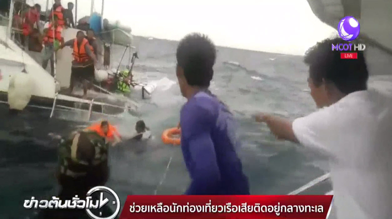 นี่เป็นภาพนาทีชีวิต ขณะเจ้าหน้าที่เร่งเข้าช่วยเหลือนักท่องเที่ยวชาวสเปน 14 คน โดยโยนห่วงยางให้แต่ละคนเกาะลอยคอมาขึ้นเรือตรวจการณ์ หลังเรือของบริษัทไทเกอร์มารีนชาร์เตอร์ เครื่องยนต์ขัดข้อง ลอยอยู่กลางทะเล ระหว่างเกาะพีพีดอนกับเกาะพีพีเล ต.อ่าวนาง อ.เมือง จ.กระบี่ เจ้าหน้าที่ใช้เวลาช่วยเหลือกว่า 1 ชั่วโมง เนื่องจากคลื่นลมแรง ต้องระมัดระวังไม่ให้เรือชนกัน สุดท้ายช่วยเหลือทุกคนขึ้นฝั่งได้อย่างปลอดภัย ส่วนตัวเรือได้ลากไปจอดที่ทุ่นจอดเรืออ่าวต้นไทร เกาะพีพีดอน เพื่อซ่อมแซม คาดนำกลับมาให้บริการได้อีกครั้งบ่ายวันนี้.-สำนักข่าวไทย