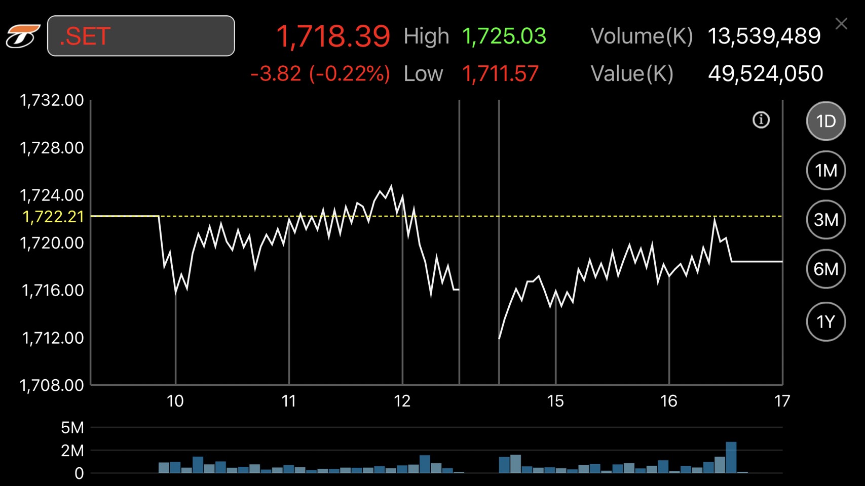 ผู้สื่อข่าวรายงานว่าดัชนีตลาดหลักทรัพย์ฯ ปิดวันนี้ที่ระดับ 1,718.39 จุด ลดลง 3.82 จุด หรือร้อยละ0.22 มูลค่าการซื้อขาย 49,524.05 ล้านบาท การซื้อขายหุ้นวันนี้ ดัชนีหุ้นไทยเคลื่อนไหวทั้งในแดนบวก-ลบ โดยดัชนีฯ แตะจุดสูงสุดที่ 1,725.03 จุด และแตะจุดต่ำสุดที่ระดับ 1,711.57 จุด