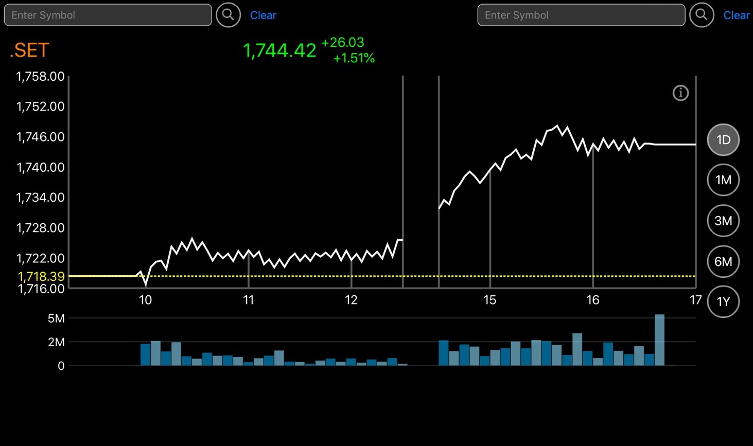 ผู้สื่อข่าวรายงานว่าดัชนีตลาดหลักทรัพย์ฯ ปิดวันนี้ที่ระดับ 1,744.42 จุด เพิ่มขึ้น 26.03 จุด หรือร้อยละ 1.51 มูลค่าการซื้อขาย 79,655.82 ล้านบาท การซื้อขายหุ้นวันนี้ดัชนีเคลื่อนไหวแดนบวกเป็นส่วนใหญ่ โดยดัชนีฯ แตะจุดสูงสุดที่ 1,748.76 จุด และแตะจุดต่ำสุดที่ระดับ 1,716.75 จุด