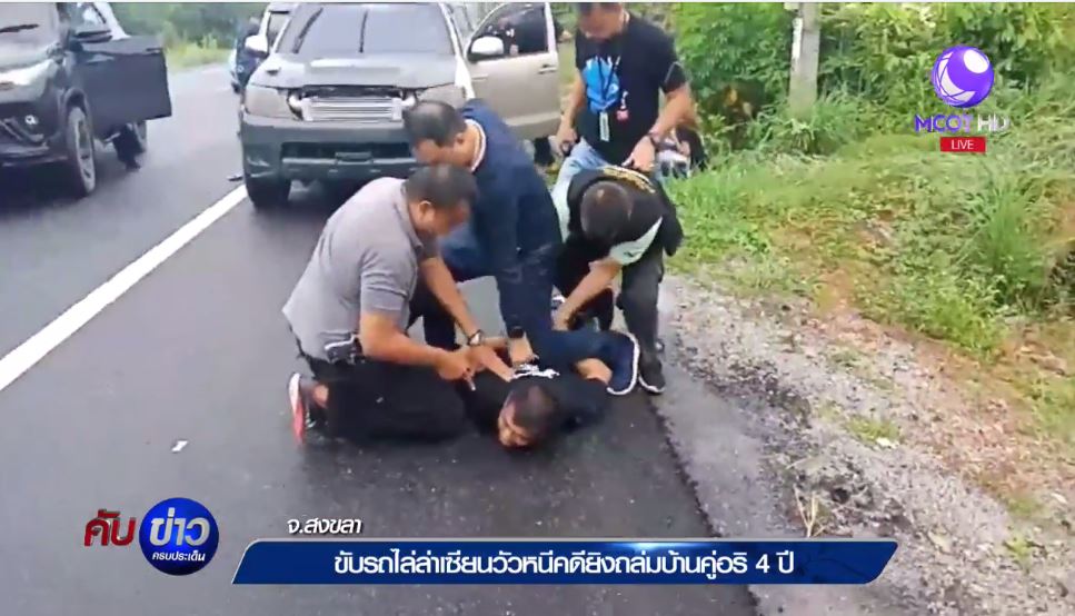 สงขลา 18 ก.ย.-ระทึก! ตำรวจกองปราบขับรถไล่ล่าเซียนวัวผู้ต้องหาคนสำคัญหนีหมายจับคดีใช้อาวุธปืนสงครามยิงถล่มบ้านคู่อริเมื่อปี 57 ขับรถพุ่งชนเจ้าหน้าที่-ฝ่าวงล้อม สุดท้ายจนมุม