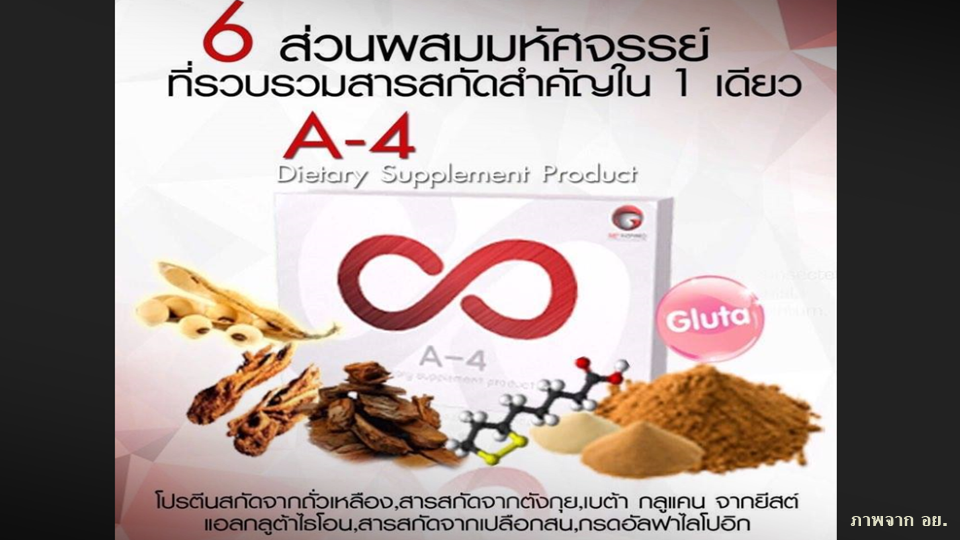 อย.19 ก.ย.-พบผลิตภัณฑ์เสริมอาหาร A-4 โฆษณาเกินจริงอวดอ้างในลักษณะช่วยเพิ่มขนาดหน้าอก ช่วยให้ระบบภายในดี พบเลข อย. ยกเลิกทะเบียนไปแล้วเมื่อวันที่ 8 พ.ค.2561 สั่งระงับโฆษณา เร่งแจ้งดำเนินคดีกับผู้เกี่ยวข้อง พร้อมแจ้งเตือนประชาชนอย่าหลงเชื่อซื้อมารับประทาน โดยเด็ดขาด เสี่ยงอันตราย