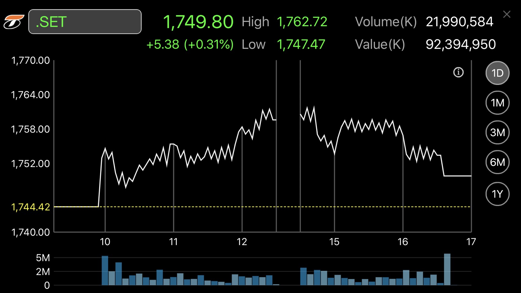 ผู้สื่อข่าวรายงานว่าดัชนีตลาดหลักทรัพย์ฯ ปิดวันนี้ (19 ก.ย.) ที่ระดับ 1,749.80 จุด เพิ่มขึ้น 5.38 จุด หรือร้อยละ0.31 มูลค่าการซื้อขาย 92,394.95 ล้านบาท การซื้อขายหุ้นวันนี้ดัชนีเคลื่อนไหวแดนบวกตลอดทั้งวัน โดยดัชนีฯ แตะจุดสูงสุดที่ 1,762.72 จุด และแตะจุดต่ำสุดที่ระดับ 1,747.47 จุด