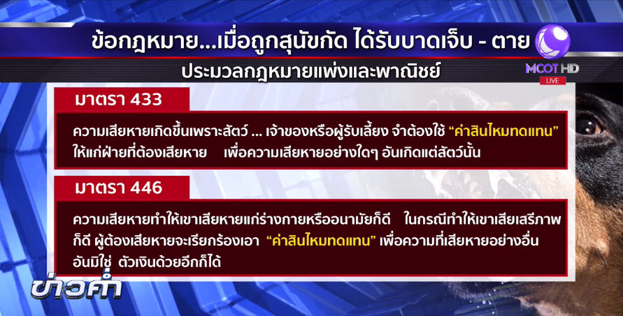 กทม. 19 ก.ย. – มีกฎหมายให้เจ้าของสุนัขหรือสัตว์เลี้ยงที่ปล่อยให้ไปกัดหรือทำร้ายบุคคลอื่น และไม่เข้ามาเยียวยาผู้บาดเจ็บ ต้องจ่ายค่าสินไหมทดแทนจากเหตุที่เกิดขึ้น นอกจากนี้ยังสามารถเอาผิดทางอาญาได้เช่นกัน