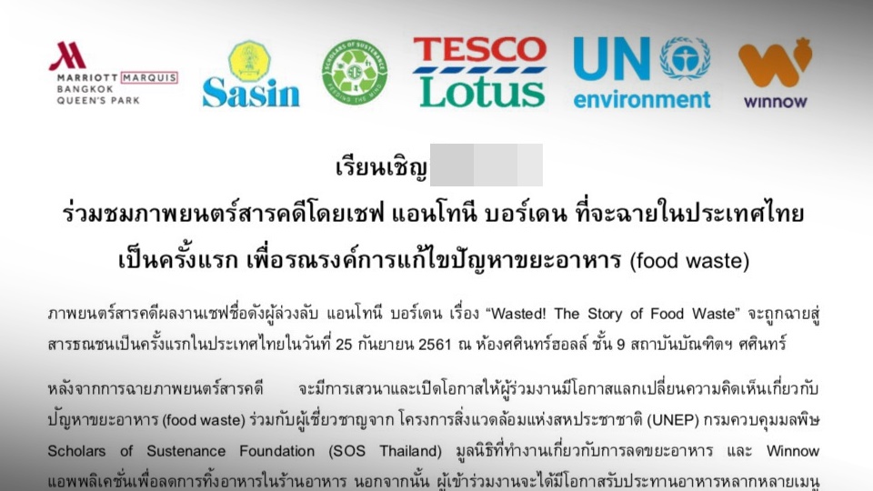รายงานข่าวแจ้งว่า ภาพยนตร์สารคดีผลงานเชฟชื่อดังผู้ล่วงลับ แอนโทนี บอร์เดน เรื่องWasted !The Sdtory of Food Waste จะฉายสู่สาธารณชนเป็นครั้งแรกในประเทศไทย ในวันที่ 25 ก.ย.นี้ ณ ห้องศศินทร์ฮอลล์ ชั้น 9 สถาบันบัณฑิตบริหารธุรกิจ ศศินทร์ แห่งจุฬาลงกรณ์มหาวิทยาลัย และหลังการฉายภาพยนตร์จะมีการเสวนาเปิดโอกาสให้ผู้ร่วมงานได้แลกเปลี่ยนความเห็นเกี่ยวกับปัญหาขยะอาหาร (food waste) ร่วมกับผู้เชี่ยวชาญจากโครงการสิ่งแวดล้อมแห่งสหประชาชาติ (UNEP) , กรมควบคุมมลพิษ , Scholars of Sustenance Foundation (SOS Thailand) มูลนิธิที่ทำงานเกี่ยวกับการลดขยะอาหาร และ Winnow แอพพลิเคชั่นเพื่อลดการทิ้งอาหารในร้านอาหาร พร้อมจะมีการปรุงอาหารหลากหลายเมนูโดยเอ็กเซ็กคิวทีฟจากโรงแรมแมริออท มาร์คีส์ ควีนส์ปาร์ค ที่ปรุงจากอาหารที่จำหน่ายไม่หมดจากเทสโก้ โลตัส ให้ผู้ร่วมงานได้รับประทาน