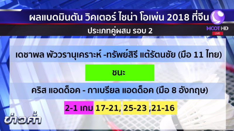 ผลแบดมินตันรายการเก็บคะแนนสะสมโลก “วิคเตอร์ ไชน่า โอเพ่น 2018” ซึ่งเป็นทัวร์นาเมนต์ในระดับบีดับเบิลยูเอฟ เวิลด์ ทัวร์ 1000 ที่เมืองฉางโจว ประเทศจีน ประเภทคู่ผสม รอบ 2 “บาส” เดชาพล พัววรานุเคราะห์ กับ “ปอป้อ” ทรัพย์สิรี แต้รัตนชัย คู่มือ 11 ของโลก ตบเอาชนะ คริส แอดด็อค และ กาเบรียล แอดด็อค คู่มือวางอันดับ 8 จากอังกฤษ 2-1 เกม 17-21, 25-23 และ 21-16