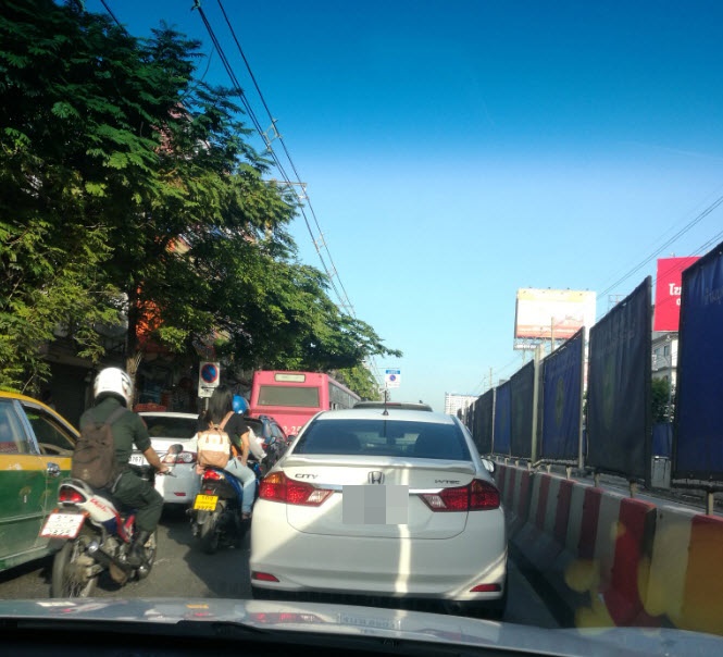 ถนนวิภาวดี-รังสิต ขาเข้า จราจรหนาแน่น รถเคลื่อนตัวช้า ท้ายสะสมเลยเซียร์รังสิต มีรถบรรทุกพ่วงจอดเสียบริเวณฝ่ายช่างการบินไทย