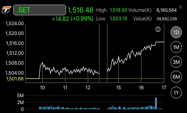ผู้สื่อข่าวรายงานว่าดัชนีตลาดหลักทรัพย์ฯ ปิดการซื้อขายวันนี้ (7 ธ.ค.) ที่ระดับ 1,520.53 จุด เพิ่มขึ้น 4.05 จุด หรือร้อยละ 0.27 มูลค่าการซื้อขาย 44,982.92 ล้านบาท ดัชนีอยู่ในช่วงแคบ ๆ สลับทั้งแดนบวกและลบ โดยดัชนีสูงสุดของวันที่ระดับ 1,523.45 จุด และต่ำสุดที่ระดับ 1,513.28 จุด