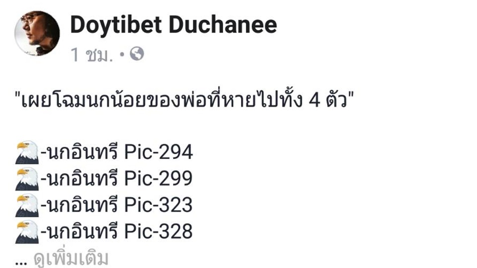 นายดอยธิเบศร์ ดัชนี บุตรชาย อ.ถวัลย์ ดัชนี ศิลปินแห่งชาติ สาขาทัศนศิลป์ พ.ศ.2544 โพสต์เฟสบุ๊ก เปิดเผยภาพนกอินทรีทั้ง 4 ภาพของ อ.ถวัลย์ ที่หายไป โดยมีข้อความว่า”เผยโฉมนกน้อยของพ่อที่หายไปทั้ง4 ตัว” นกอินทรี Pic-294 นกอินทรีPic-299 นกอินทรี Pic-323 นกอินทรี Pic-328 ปล.เรียงลำดับภาพตามเข็มนาฬิกา พร้อมติดแฮชแท็ก #ความจริงเสียงดังเสมอ #นกน้อยของพ่อที่หายไป #เราจะพานกกลับรัง