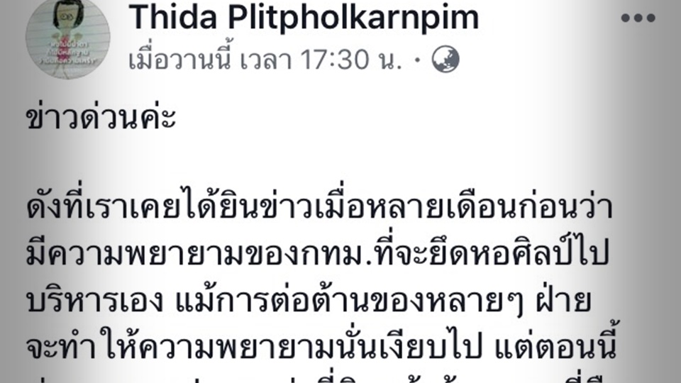 ขณะที่โลกออนไลน์แห่แชร์ข้อความจากบรรดาศิลปิน ที่โพสต์เฟซบุ๊ก นัดรวมตัวแสดงพลังพร้อมแต่งชุดดำไว้อาลัย ที่ กทม.ไม่ให้งบประมาณในการบริหารงานหอศิลป์ฯในวันพุธที่ 26 ก.ย.นี้ เวลา 13.30 น. ชั้น 1 ห้องลานเอนกประสงค์ พร้อมแถลงนโยบายรัดเข็มขัดจากผู้บริหารหอศิลป์ฯ กทม.-สำนักข่าวไทย