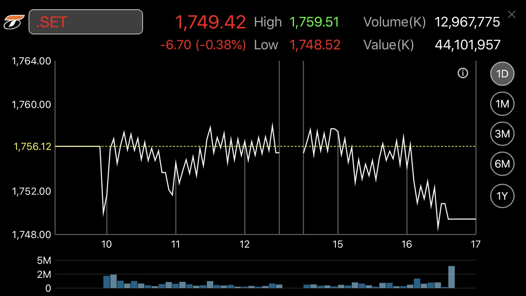 ผู้สื่อข่าวรายงานว่าดัชนีหุ้นไทยปิดวันนี้ (24 ก.ย.) ที่ระดับ 1,749.42 จุด ลดลง 6.70 จุด หรือร้อยละ 0.38 มูลค่าการซื้อขาย 44,101.96 ล้านบาท