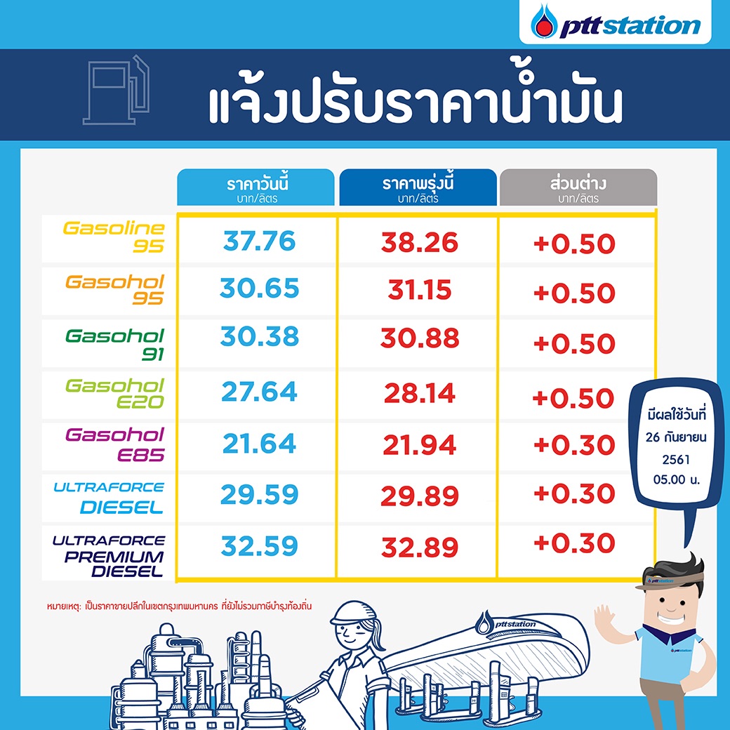 บมจ.ปตท.-บางจากฯ ปรับราคาขายปลีกน้ำมันทุกชนิดเพิ่มขึ้น 50 สตางค์ต่อลิตร ส่วน E85 และดีเซล ดีเซลพรีเมี่ยม เพิ่มขึ้น 30 สตางค์ต่อลิตร มีผล 26 กันยายน 2561 เวลา 05.00 น. เป็นต้นไป โดยราคาขายปลีกเบนซิน 95 ลิตรละ 38.26 บาท แก๊สโซฮอล์ 95 ลิตรละ 31.15 บาท E20 ลิตรละ 28.14 บาท แก๊สโซฮอล์ 91 ลิตรละ 30.88 บาท E85 ลิตรละ 21.94 บาท ดีเซล 29.89 บาท และดีเซลพรีเมี่ยม 32.89 บาทต่อลิตร โดยราคาขายปลีกข้างต้นยังไม่รวมภาษีบำรุงกรุงเทพมหานคร.-สำนักข่าวไทย