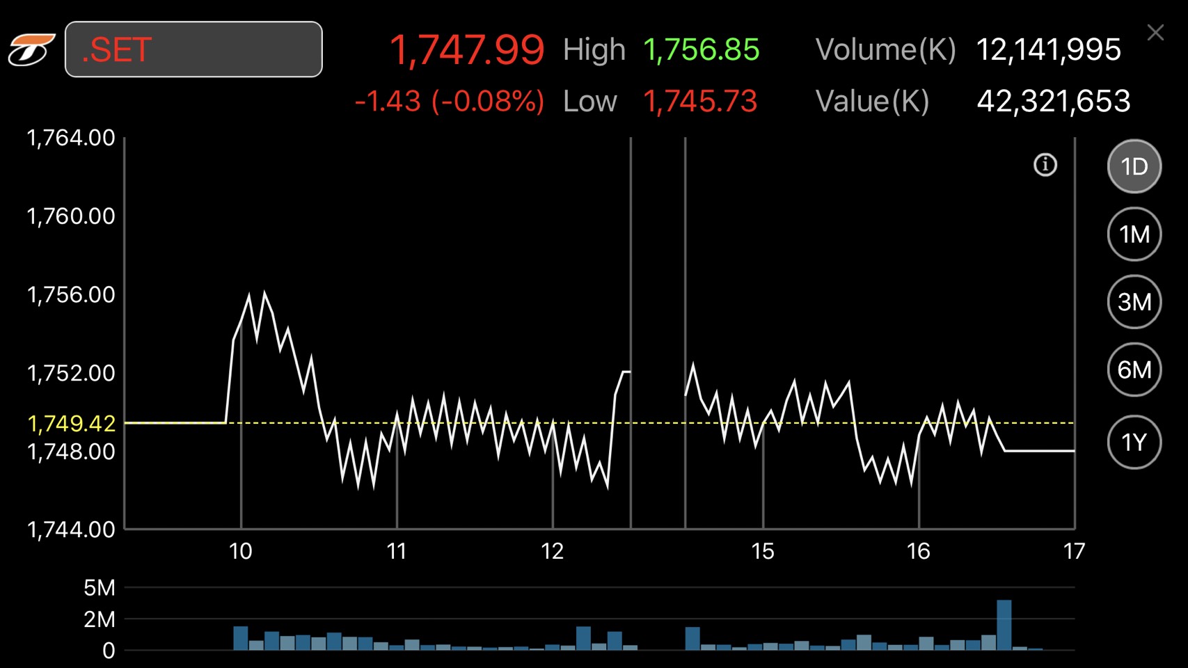 ผู้สื่อข่าวรายงานว่าดัชนีตลาดหลักทรัพย์ปิดวันนี้ที่ระดับ 1,747.99 จุด ลดลง 1.43 จุด หรือร้อยละ 0.08 มูลค่าการซื้อขาย 42,321.65 ล้านบาท การซื้อขายหุ้นวันนี้ดัชนีเคลื่อนไหวกรอบแคบทั้งแดนบวก-ลบ โดยดัชนีฯ แตะจุดสูงสุดที่ 1,756.85 จุด และแตะจุดต่ำสุดที่ระดับ 1,745.73 จุด ตลาดหุ้นไทยเงียบเหงาเหมือนกับทั้งภูมิภาคเอเชียในช่วงระหว่างรอการประชุมธนาคารกลางสหรัฐ (เฟด) วันที่ 25-26 กันยายนนี้ ซึ่งตลาดฯ คาดว่าจะปรับขึ้นอัตราดอกเบี้ยร้อยละ 0.25