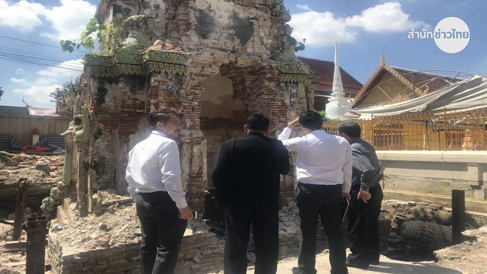 นายอนันต์ ชูโชติ อธิบดีกรมศิลปากร พร้อมนายอารักษ์ สังหิตกุล อดีตอธิบดีกรมศิลปากร ในฐานะที่ปรึกษาด้านวิศวกรรม กรมศิลปากร ลงพื้นที่ตรวจสอบความเสียหายแผนบูรณะเจดีย์ยักษ์ หรือหอระฆังวัดพระยาทำวรวิหาร เขตบางกอกน้อย หลังพังถล่มเมื่อวานที่ผ่านมา