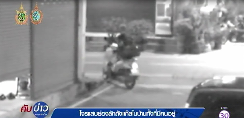 ทั้งนี้ ภาพวงจรปิดสามารถจับภาพโจรแสบที่ย่องเข้ามาลักเตาแก๊สปิกนิก เวลาประมาณ 19.38 น. มีหนุ่มรูปร่างผอมสูง สวมเสื้อบอลและกางเกงบอล ขี่รถจักรยานยนต์ ยามาฮ่าฟีโน่ สีครีม ทะเบียนมองไม่ชัด มาจอดด้านข้างบ้าน โดยประตูเหล็กม้วนยังไม่ได้ปิดลงมา คนร้ายมาเดินดูภายในบ้านประมาณ 2 นาที ก่อนขี่รถจักรยานยนต์ออกไปประมาณ 19.40 น.