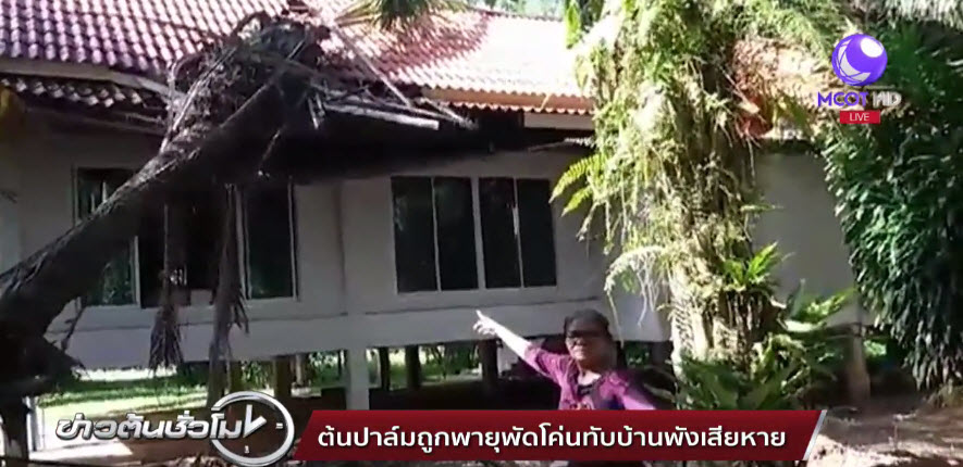 คนงานเข้ารื้อถอนต้นปาล์มน้ำมันสูง 12 เมตร อายุกว่า 20 ปี ที่ถูกพายุถล่ม โค่นทับหลังคาบ้านของนางกัลยา สิงห์ชัย วัย 66 ปี ในอำเภอลำทับ จังหวัดกระบี่ ทำให้หลังคาบ้านและโครงสร้างบางส่วนพังเสียหาย นางกัลยาเล่าว่าก่อนเกิดเหตุมีลมกระโชกแรง จากนั้นต้นปาล์มน้ำมันข้างบ้านที่ยืนต้นตายมานานได้ถูกแรงลมพัดหักโค่น แต่โชคดีช่วงเกิดเหตุไปเฝ้าแม่ที่ป่วย ส่วนสามีไปกรีดยาง ทำให้ไม่มีใครได้รับอันตราย ขณะนี้ผู้ใหญ่บ้านได้เข้ามาสำรวจและประสาน อบต. ให้ความช่วยเหลือแล้ว.-สำนักข่าวไทย