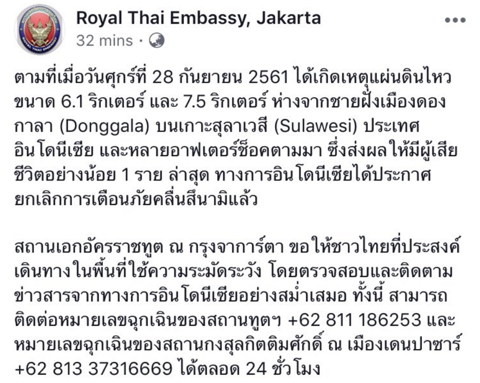 กระทรวงการต่างประเทศ ระบุว่าตามที่เมื่อวันศุกร์ที่ 28 กันยายน 2561 ได้เกิดเหตุแผ่นดินไหวขนาด 6.1 ริกเตอร์ และ 7.5 ริกเตอร์ ห่างจากชายฝั่งเมืองดองกาลา (Donggala) บนเกาะสุลาเวสี (Sulawesi) ประเทศอินโดนีเซีย และหลายอาฟเตอร์ช็อกตามมา ซึ่งส่งผลให้มีผู้เสียชีวิตอย่างน้อย 1 ราย ล่าสุดทางการอินโดนีเซียได้ประกาศยกเลิกการเตือนภัยคลื่นสึนามิแล้ว