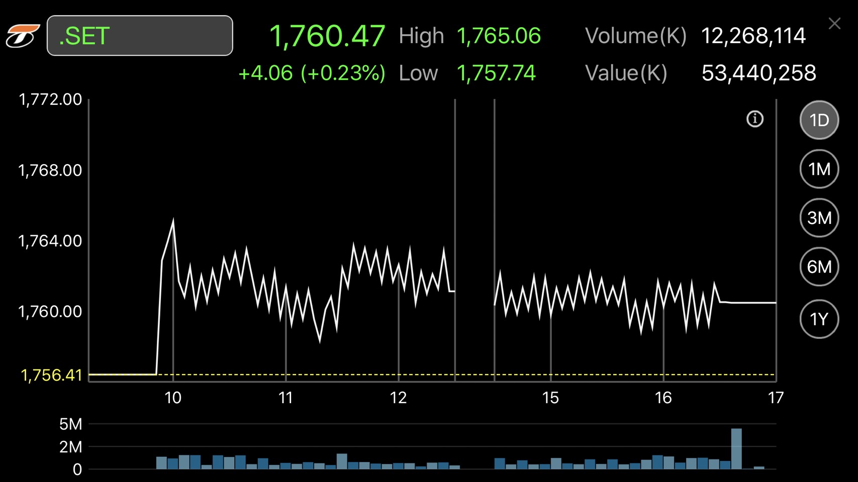 ตลาดหลักทรัพย์ฯ ปิดวันนี้ที่ระดับ 1,760.47 จุด เพิ่มขึ้น 4.06 จุด (+0.23%) มูลค่าการซื้อขาย 53,440.26 ล้านบาท การซื้อขายหุ้นวันนี้ ดัชนีหุ้นไทยแตะจุดสูงสุดที่ 1,765.06 จุด และแตะจุดต่ำสุดที่ระดับ 1,757.74 จุด
