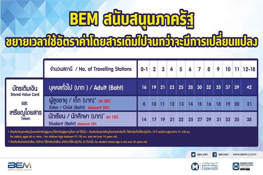 ตามที่บริษัท ทางด่วนและรถไฟฟ้ากรุงเทพ จำกัด (มหาชน) หรือบีอีเอ็มแจ้งใช้อัตราค่าโดยสารเดิมถึงวันที่ 2 ตุลาคม 2561 นั้น เพื่อเป็นการสนับสนุนนโยบายของภาครัฐที่ต้องการแบ่งเบาภาระของผู้ใช้บริการ บริษัทฯ จึงขอแจ้งขยายเวลาใช้อัตราค่าโดยสารเดิมจนกว่าจะมีการเปลี่ยนแปลง โดยเริ่มต้นที่ 16 บาท สูงสุด 42 บาท พร้อมทั้งส่วนลดพิเศษสำหรับเด็กและผู้สูงอายุร้อยละ 50 และสำหรับนักเรียน นักศึกษาร้อยละ 10 ของอัตราค่าโดยสารบุคคลทั่วไป.-สำนักข่าวไทย
