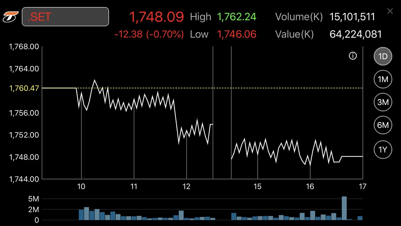 การซื้อขายหุ้นวันนี้ ดัชนีหุ้นไทยเคลื่อนไหวในแดนลบเป็นส่วนใหญ่ โดยดัชนีฯแตะจุดสูงสุดที่ 1,762.24 จุด และแตะจุดต่ำสุดที่ระดับ 1,746.06 จุด