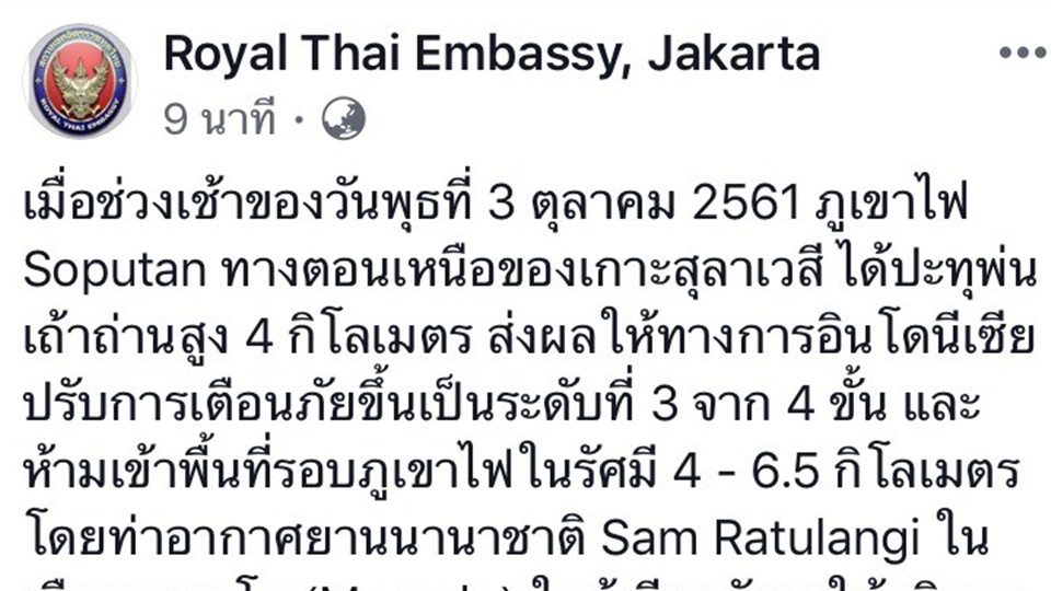 สถานเอกอัครราชทูต ณ กรุงจาการ์ตา โพสต์ข้อความผ่านทางเฟซบุ๊ก ระบุว่า เมื่อช่วงเช้าวันนี้ (3 ต.ค.) ภูเขาไฟ Soputan ทางตอนเหนือของเกาะสุลาเวสี ได้ปะทุพ่นเถ้าถ่านสูง 4 กิโลเมตร ส่งผลให้ทางการอินโดนีเซียปรับการเตือนภัยขึ้นเป็นระดับที่ 3 จาก 4 ขั้น และห้ามเข้าพื้นที่รอบภูเขาไฟ ในรัศมี 4-6.5 กิโลเมตร โดยท่าอากาศยานนานาชาติ Sam Ratulangi ในเมืองมานาโด (Manado) ใกล้เคียงยังคงให้บริการตามปกติ