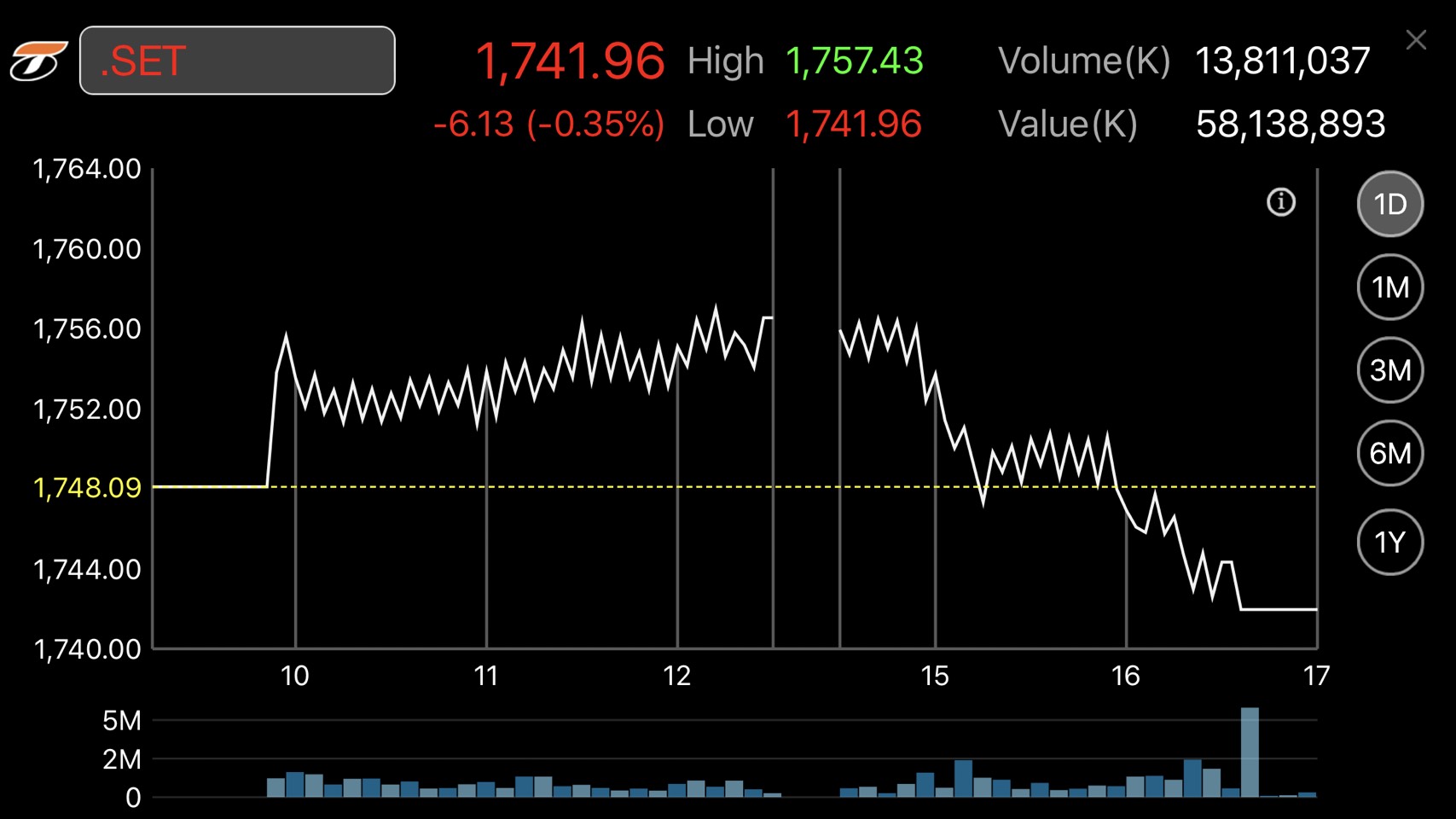 การซื้อขายหุ้นวันนี้ ดัชนีหุ้นไทยเคลื่อนไหวทั้งในแดนบวก-ลบ โดยดัชนีฯแตะจุดสูงสุดที่ 1,757.43 จุด และแตะจุดต่ำสุดที่ระดับ 1,741.96 จุด