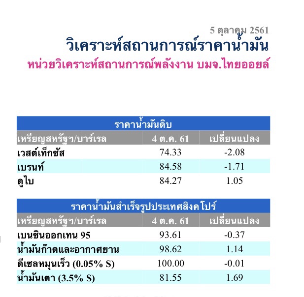 อย่างไรก็ตามล่าสุดน้ำมันดิบตลาดเบรนท์และเวสต์เท็กซัสปิดวานนี้ได้ลดลงประมาณ 2 ดอลลาร์/บาร์เรล ด้าน บมจ.ไทยออยล์วิเคราะห์ว่าเกิดจากนักลงทุนเทขายสัญญาซื้อขายน้ำมันดิบล่วงหน้าเพื่อทำกำไรหลังปรับขึ้นแตะระดับสูงสุดในรอบ 4 ปีและข่าวการปรับพิ่มกำลังการผลิตโดย ผู้ผลิตน้ำมันดิบกลุ่มโอเปกสามารถปรับเพิ่มกำลังการผลิตน้ำมันดิบได้แล้วกว่า 1.3 ล้านบาร์เรลต่อวัน จากการที่ซาอุดีอาระเบียตกลงร่วมกับรัสเซียในเดือน ก.ย. 2561 ในข้อตกลงการปรับเพิ่มกำลังการผลิตเพื่อลดความร้อนแรงของราคาน้ำมันดิบลง หลังนายโดนัลด์ ทรัมป์ ประธานาธิบดีสหรัฐได้ตำหนิผู้ผลิตน้ำมันดิบกลุ่มโอเปกว่าเป็นสาเหตุที่ทำให้ราคาน้ำมันดิบมีราคาสูง-สำนักข่าวไทย