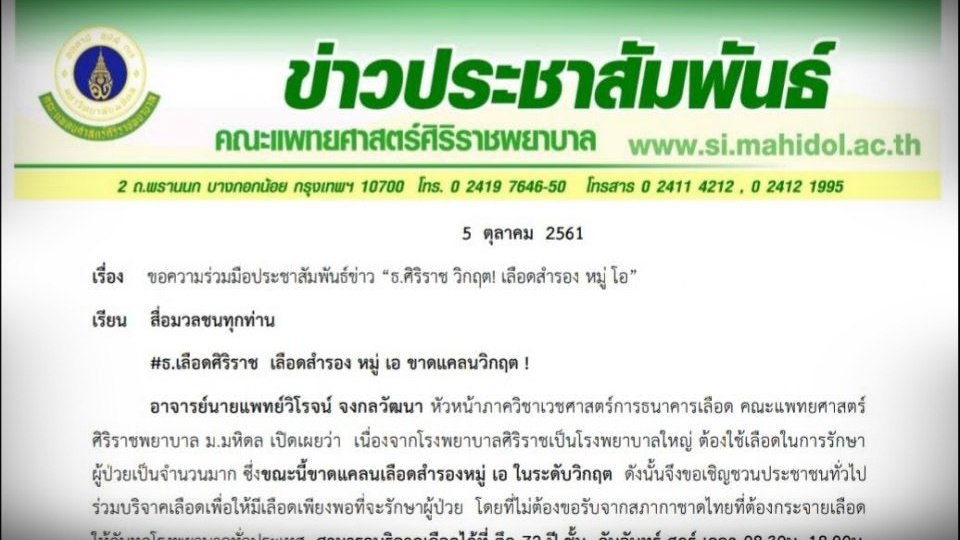 นพ.วิโรจน์ จงกลวัฒนา หัวหน้าภาควิชาเวชศาสตร์การธนาคารเลือด คณะแพทยศาสตร์ ศิริราชพยาบาล มหาวิทยาลัยมหิดล เปิดเผยว่า เนื่องจากโรงพยาบาลศิริราชเป็นโรงพยาบาลใหญ่ ต้องใช้เลือดในการรักษา ผู้ป่วยเป็นจำนวนมาก ซึ่งขณะนี้ขาดแคลนเลือดสำรอง กรุ๊ป เอ ในระดับวิกฤต ดังนั้นจึงขอเชิญชวนประชาชนทั่วไป ร่วมบริจาคเลือดเพื่อให้มีเลือดเพียงพอที่จะรักษาผู้ป่วย โดยที่ไม่ต้องขอรับจากสภากาชาดไทยที่ต้องกระจายเลือด ให้กับทุกโรงพยาบาลทั่วประเทศ